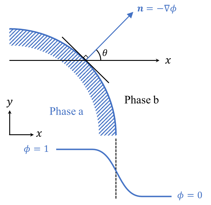 界面異方性のエネルギーを考えるため、界面方向に依存性する勾配係数\(a(\theta)\)を取り入れます。a相(\(\phi=1\))からb相(\(\phi=0\))へ向かう法線ベクトル\(\boldsymbol{n}\)は次式で与えられます。